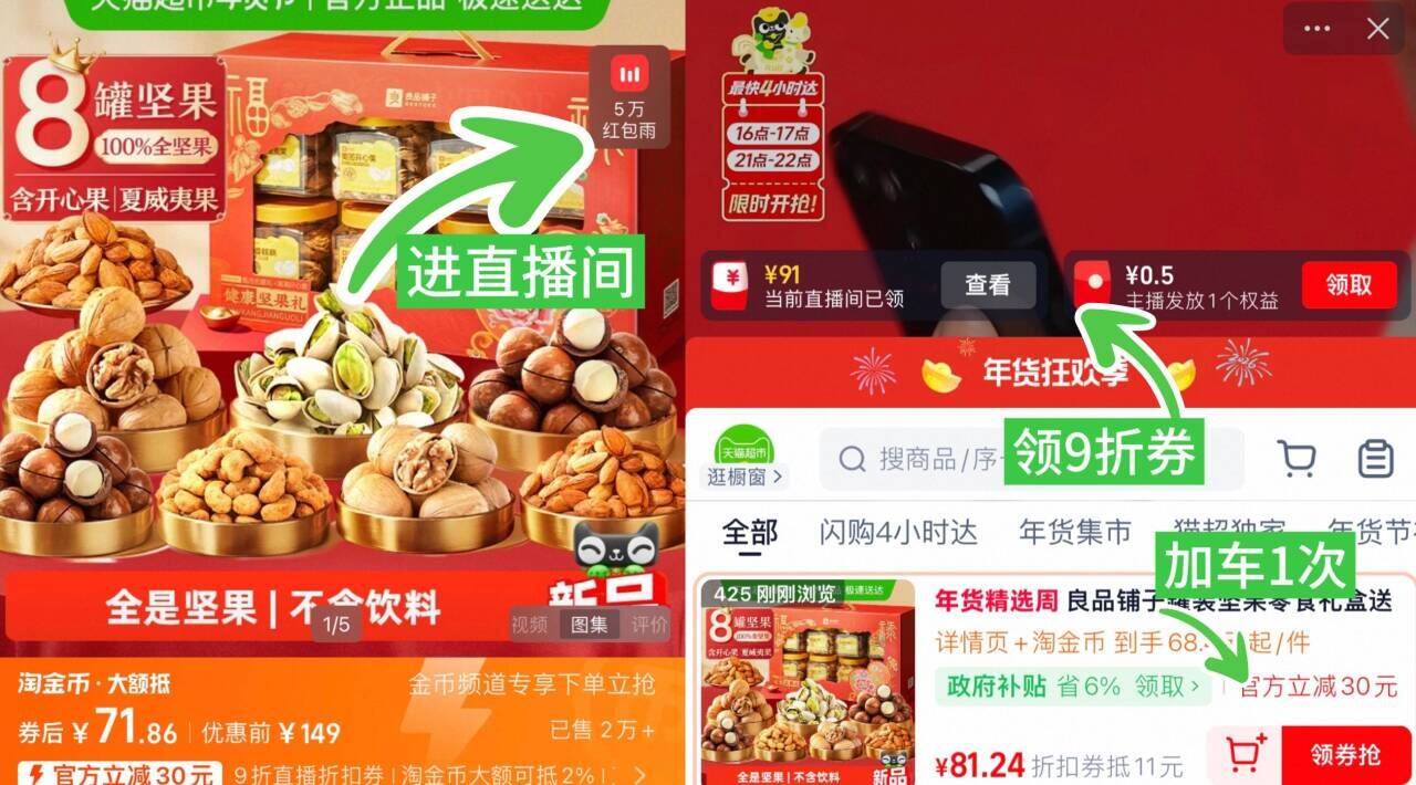 68.9亓,8罐,折8.6/罐 良品铺子8罐装坚果礼盒1270g ①进直播间领9折券 加车1次好单发报员2026年01月30日 16:450举报 68.9亓,8罐,折8.6/罐良品铺子8罐装坚果礼盒1270g①进直播间领9折券 加车1次②右上角进淘金币 加车1次③购物车修改数量拍“1”https://m.tb.cn/h.7JStthe复制文案