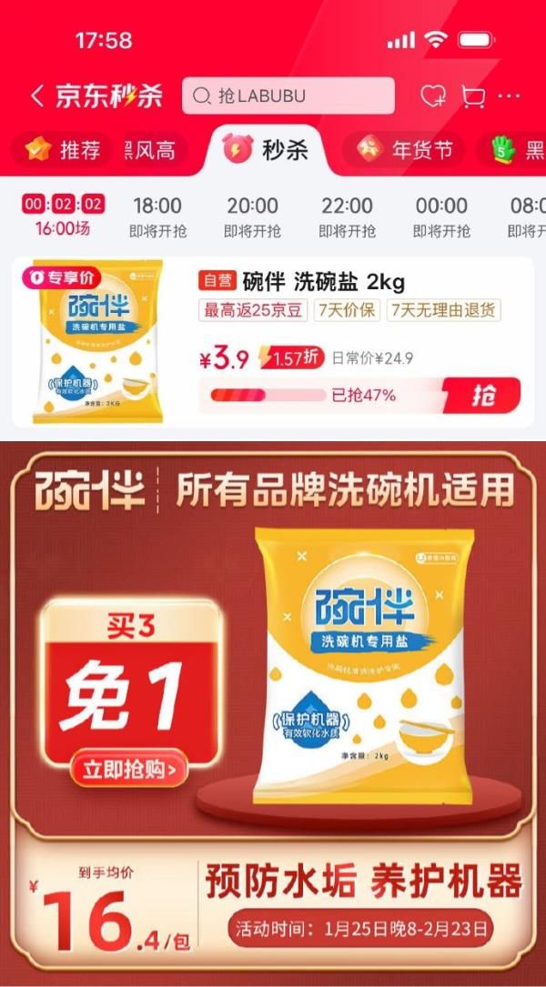 碗伴 洗碗盐2kg,砸6-5券叠2首单【3.9】