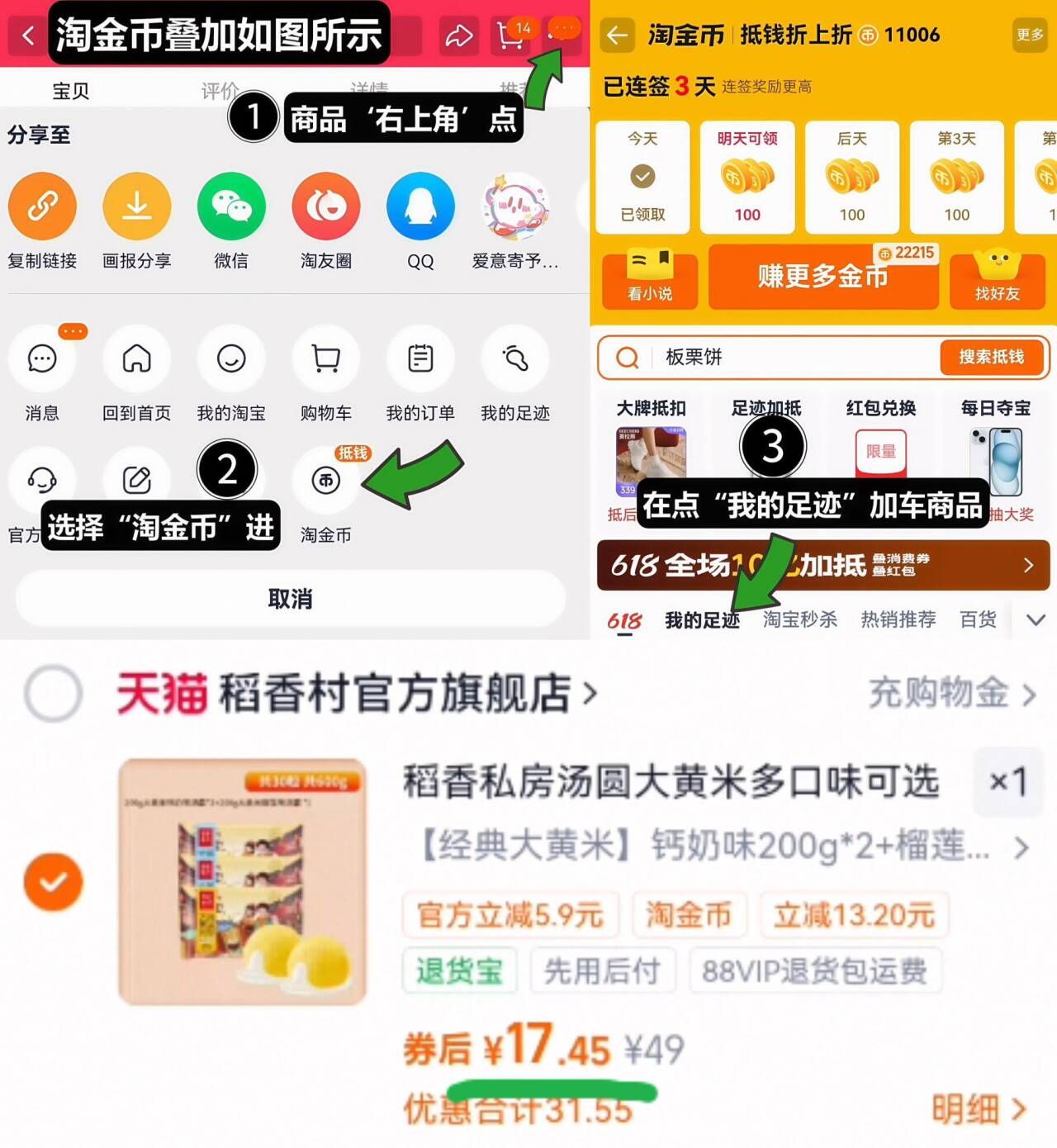 17.4亓速度叠2.4金币 稻香村 大黄米汤圆200g*3袋 1、如图点右上角3个点,选淘金币好单发报员2026年01月30日 18:560举报 17.4亓速度叠2.4金币【稻香村】大黄米汤圆200g*3袋1、如图点右上角3个点,选淘金币2、选我的足迹-找到商品拍下https://m.tb.cn/h.7r7UdbF复制文案