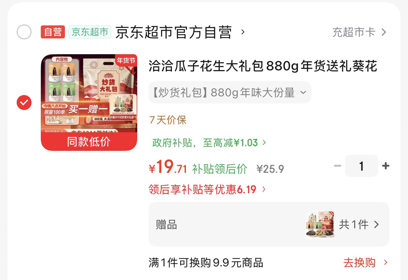 洽洽瓜子花生大礼包880g,凑后【19.71】,目前有买一送一到手2件https://u.jd.com/JDPGZsp
