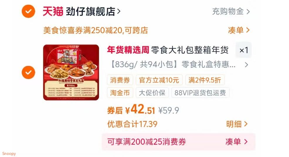 劲仔零食大礼包836g42元 - 1.商品右上3个点,选淘金币好单发报员2026年01月30日 23:070举报 劲仔零食大礼包836g42元-1.商品右上3个点,选淘金币2.选 我的足迹-找到商品拍下https://m.tb.cn/h.7IlgiB6复制文案