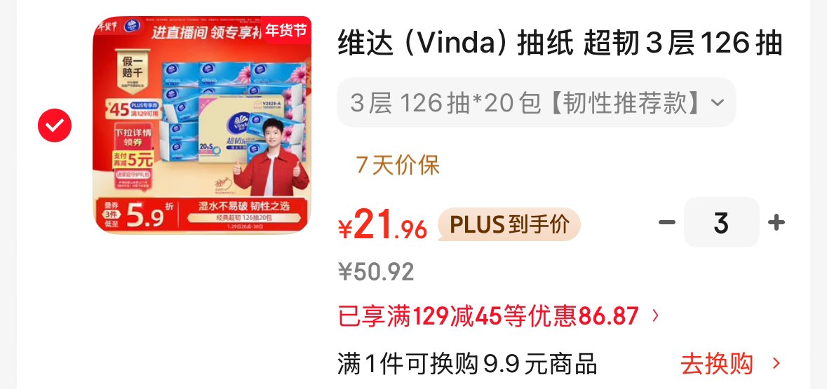 维达抽纸 超韧3层126抽*20包