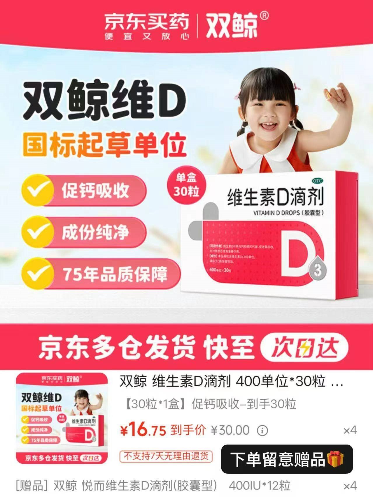 冲双鲸维D炒底 自营 双鲸 维D3滴剂30粒 买4件73亓,plus实.付67亓好单发报员2026年01月31日 14:240举报 ——冲双鲸维D炒底——【自营】双鲸 维D3滴剂30粒https://u.jd.com/J1BJ6F7买4件73亓,plus实.付67亓*赠同款48粒 才0.39/粒 速渡复制文案