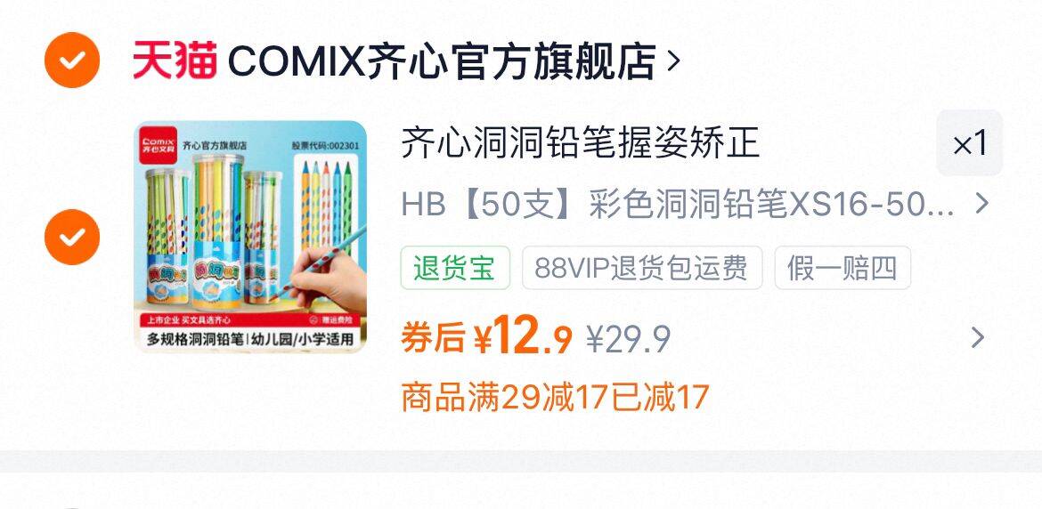 12.9亓,折0.2/支 齐心 彩色洞洞铅笔50支/桶 好单发报员 2026年01月31日 16:36 0 举报 12.9亓,折0.2/支齐心 彩色洞洞铅笔50支/桶https://m.tb.cn/h.7Ic18gm 复制文案