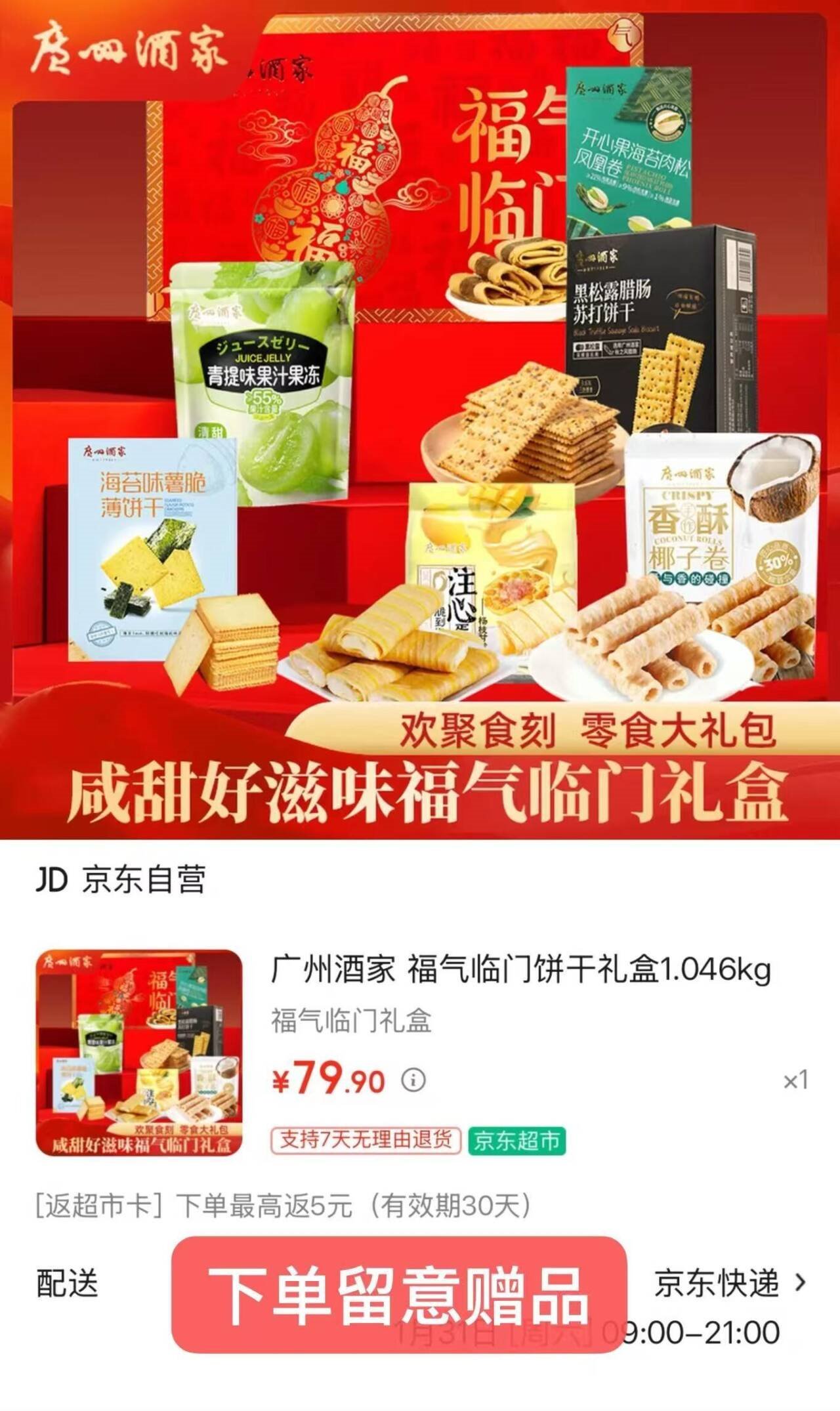 年货好礼提前备 广州酒家 福气临门饼干1.046kg 59.9自营包邮,反5亓超.市卡好单发报员2026年01月31日 17:190举报 ——年货好礼提前备——广州酒家 福气临门饼干1.046kghttps://u.jd.com/JGpq3Ey59.9自营包邮,反5亓超.市卡*低至54.9 品质国货 囤上送礼复制文案