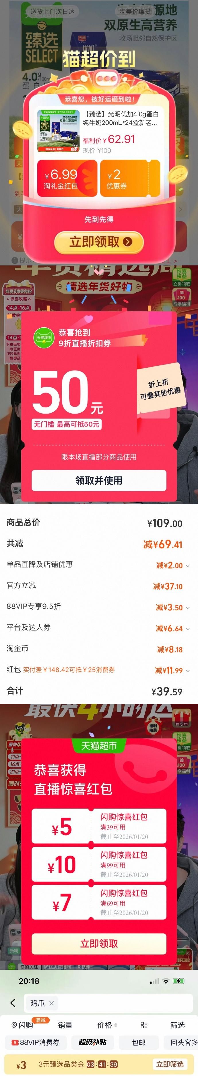 (如没5福袋,直播间右上角惊喜权益部分有39-5红包)