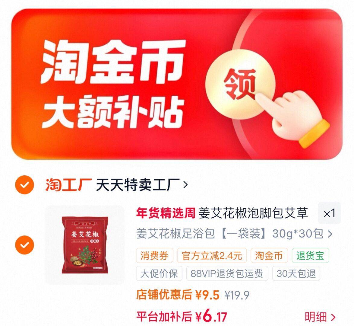 下拉详情拍,6.1亓 姜艾泡脚足浴包30包900g好单发报员2026年01月31日 18:460举报 下拉详情拍,6.1亓姜艾泡脚足浴包30包900ghttps://m.tb.cn/h.7sWe7U9复制文案