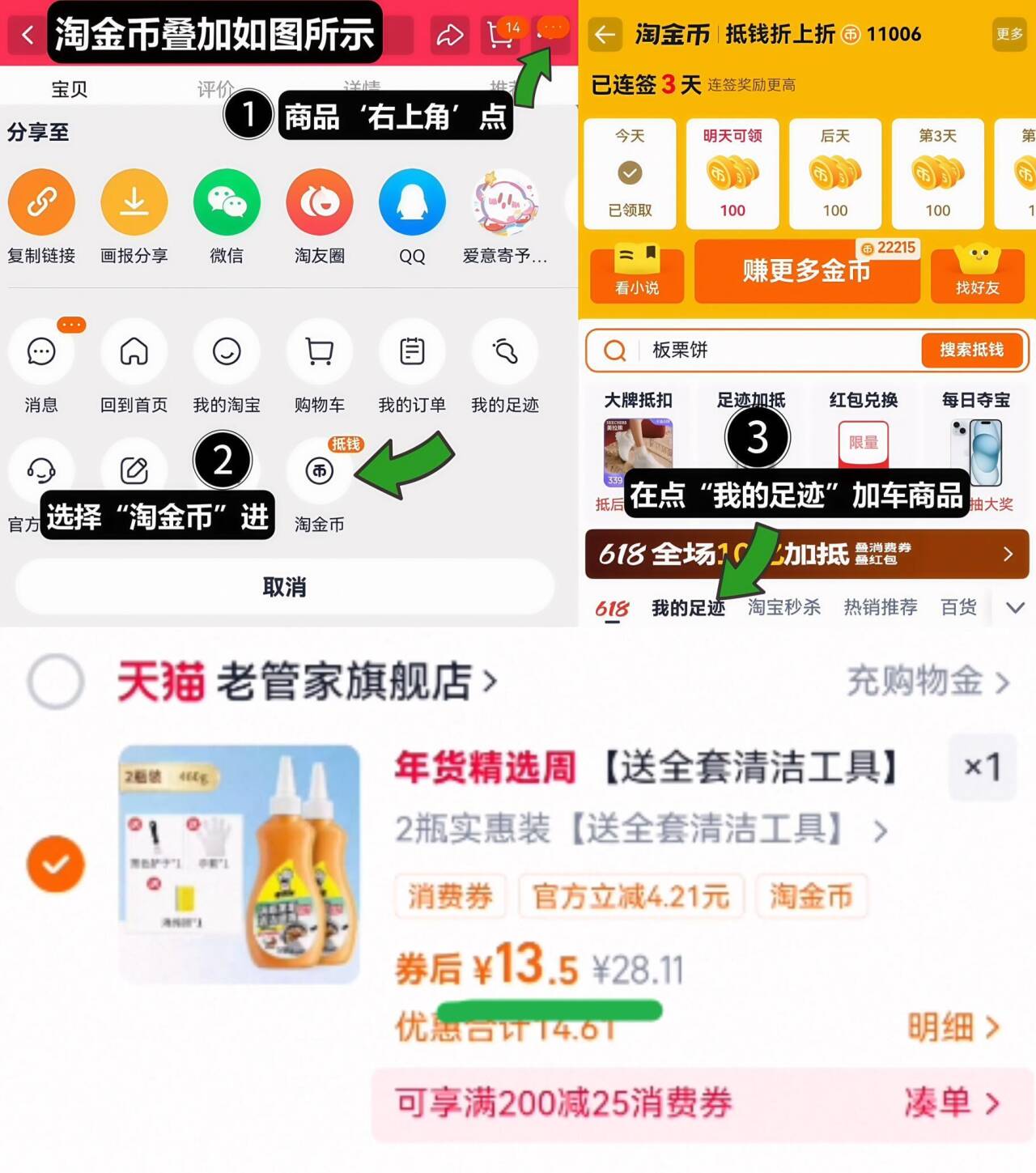 6.7亓/瓶叠1.4金币 拍下13.5亓,拍2瓶选项 老管家 锅底黑垢清洁剂230g*2好单发报员2026年01月31日 21:020举报 6.7亓/瓶叠1.4金币拍下13.5亓,拍2瓶选项【老管家】锅底黑垢清洁剂230g*21、如图点右上角3个点,选淘金币2、选我的足迹-找到商品加车拍下https://m.tb.cn/h.7IUZi1z复制文案