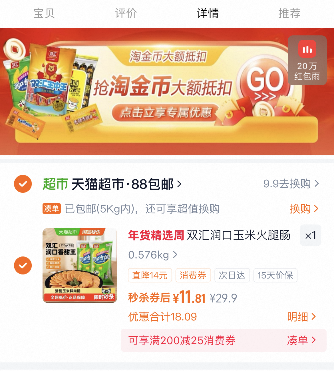 下拉详情拍,11亓,折5.5亓/袋 双汇润口玉米火腿肠270g*2袋 好单发报员 2026年01月31日 21:39 0 举报 下拉详情拍,11亓,折5.5亓/袋双汇润口玉米火腿肠270g*2袋https://m.tb.cn/h.7s5asaJ 复制文案