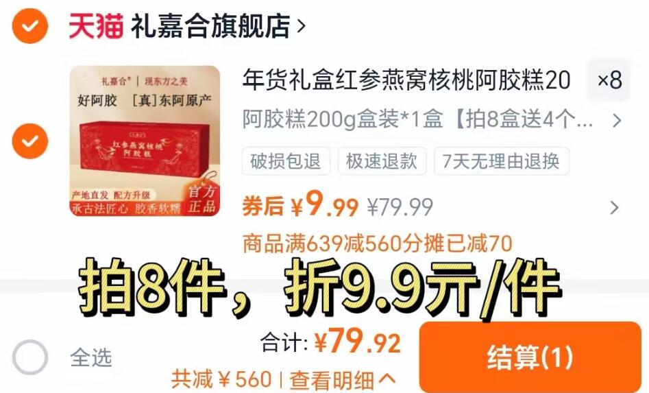 神圿先锁折9.9亓/盒 拍8件79.9亓!赠手提袋4个 礼嘉合 燕窝阿胶糕200g*8盒 好单发报员 2026年02月01日 00:35 0 举报 神圿先锁折9.9亓/盒拍8件79.9亓!赠手提袋4个【礼嘉合】燕窝阿胶糕200g*8盒https://m.tb.cn/h.7Ii2INr 复制文案