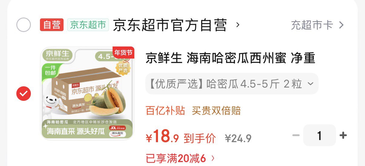 京鲜生 海南哈密瓜西州蜜 拍下18.9亓 净重4.5-5斤好单发报员2026年02月01日 10:500举报 京鲜生 海南哈密瓜西州蜜 拍下18.9亓 净重4.5-5斤https://u.jd.com/J6Wy9DV 复制文案