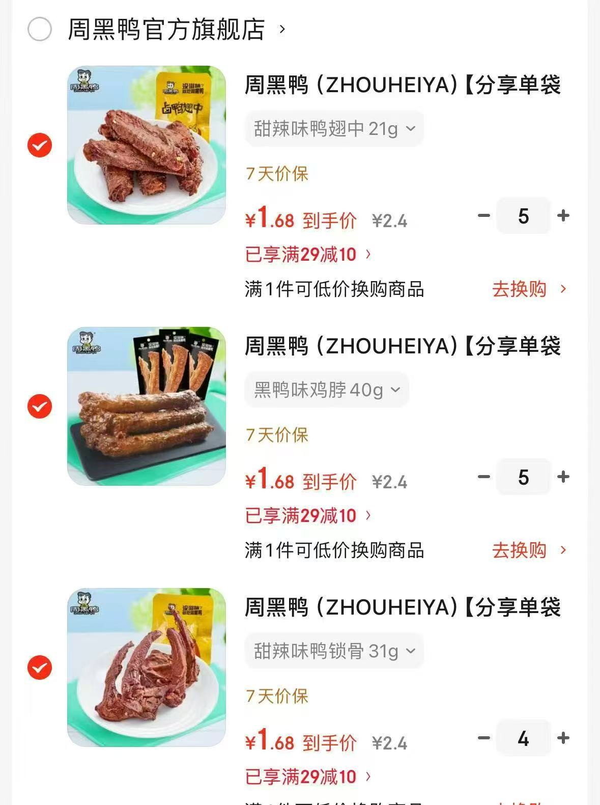 周黑鸭 真空甜辣味卤鸭脖锁骨鸭翅 甜辣味鸭脖等,任选14件 折1.6/件