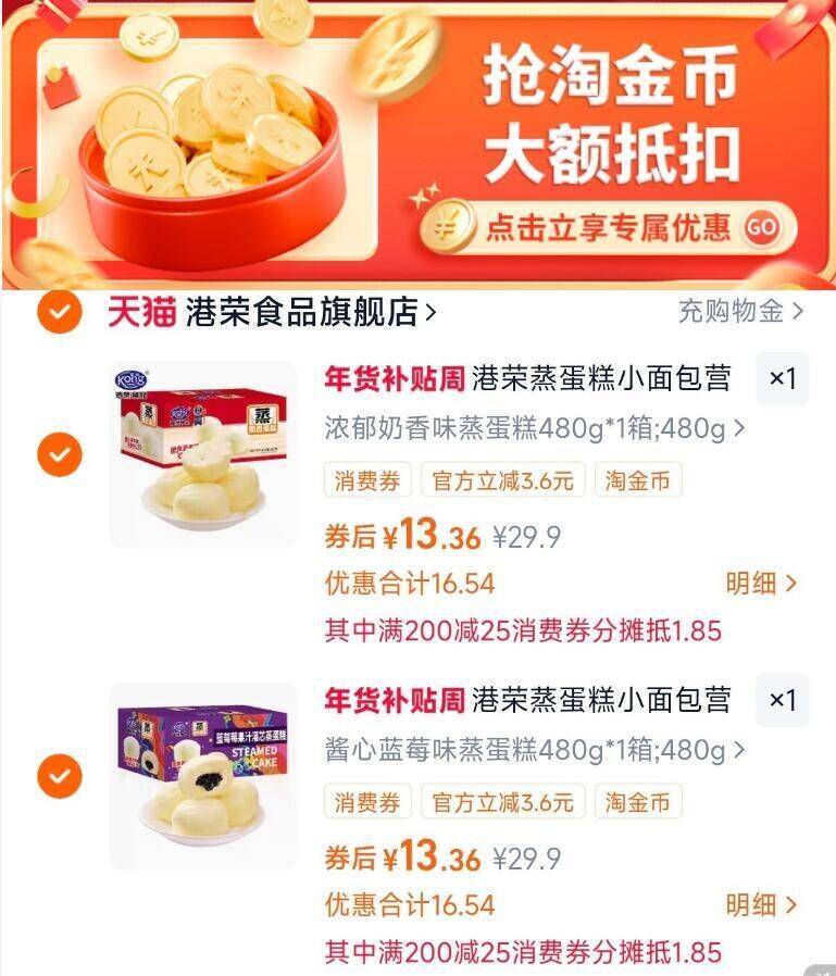 2、凑1件,用200-25消费券