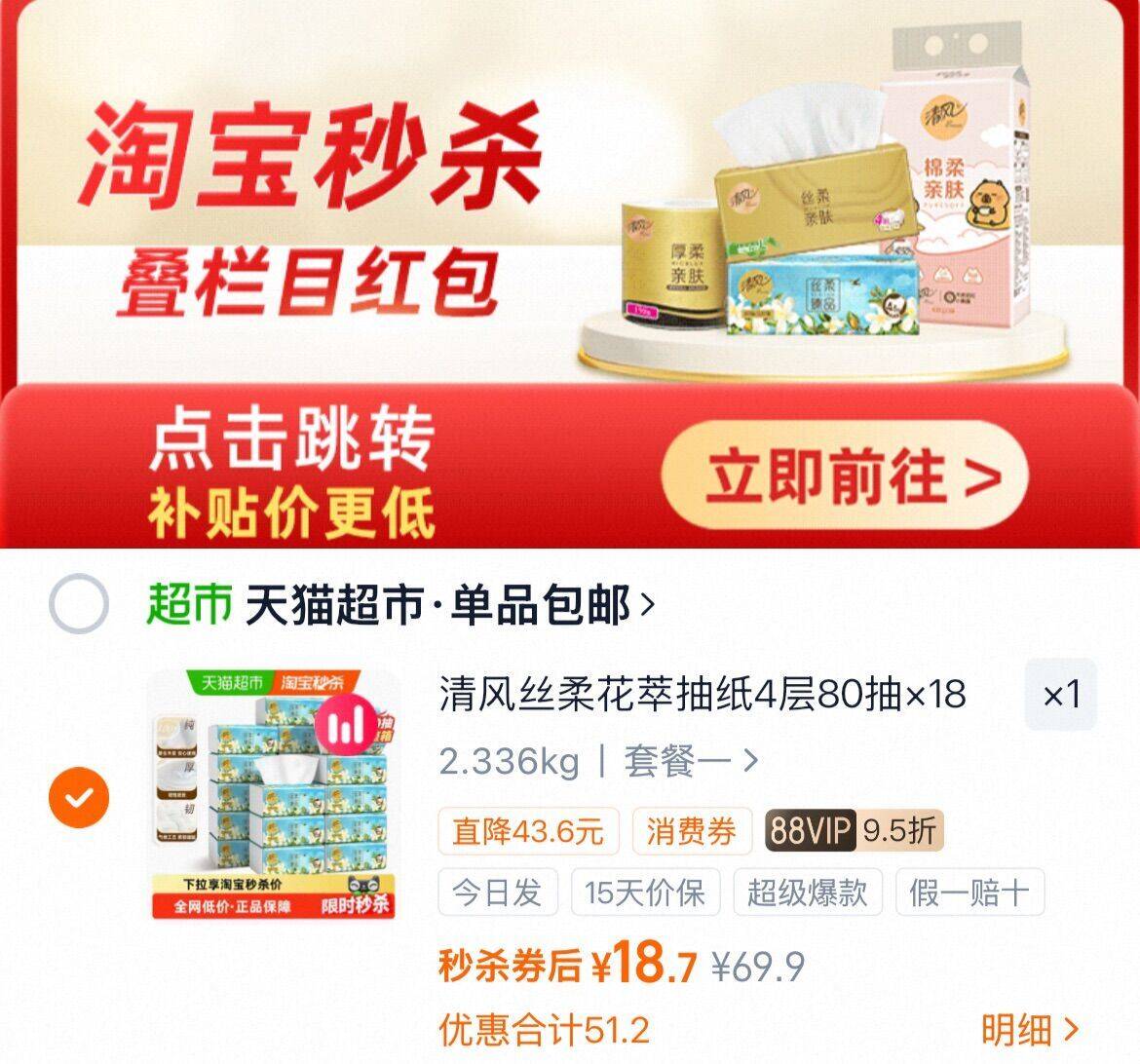 下拉详情拍,vip 18.7亓 清风 花萃抽纸4层加厚18包好单发报员2026年02月01日 15:140举报 下拉详情拍,vip 18.7亓清风 花萃抽纸4层加厚18包https://m.tb.cn/h.7IvTp4K复制文案