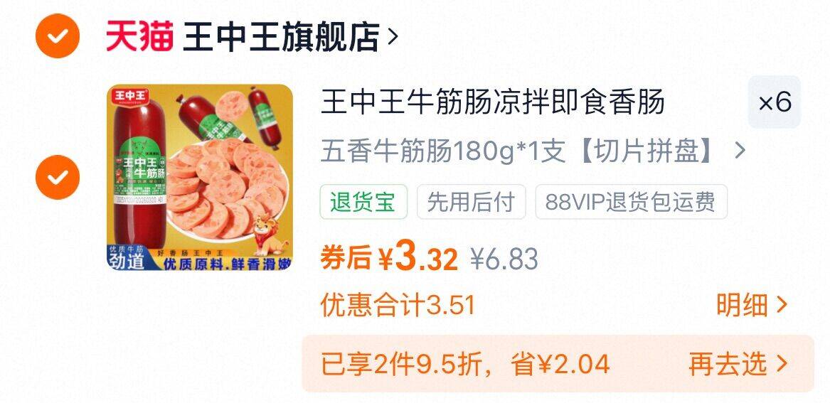 拍6件,折3.3元/件 王中王 牛筋肠共180g*6根好单发报员2026年02月01日 18:500举报 拍6件,折3.3元/件王中王 牛筋肠共180g*6根https://m.tb.cn/h.7IN85DH复制文案