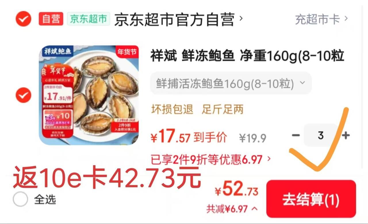 1.4元/个 自营鲍鱼! 自营 祥斌 鲜冻鲍鱼 净重160g8-10粒 拍3件返10卡后42.73元!速度啦! 好单发报员 2026年02月02日 10:17 0 举报 1.4元/个 自营鲍鱼!【自营】祥斌 鲜冻鲍鱼 净重160g8-10粒https://u.jd.com/JDJIBfv 拍3件返10卡后42.73元!速度啦! 复制文案