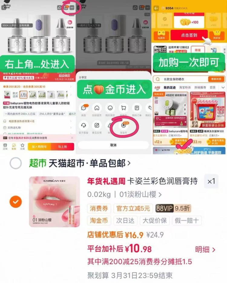 1.商品右上3个点,选淘金币 2.选 我的足迹-找到商品拍下 -好单发报员2026年02月02日 11:370举报 1.商品右上3个点,选淘金币2.选 我的足迹-找到商品拍下-卡姿兰有色润唇膏口红任选https://m.tb.cn/h.7H9gFxE需叠88的200-25消费券再叠标题下99-10购物券复制文案