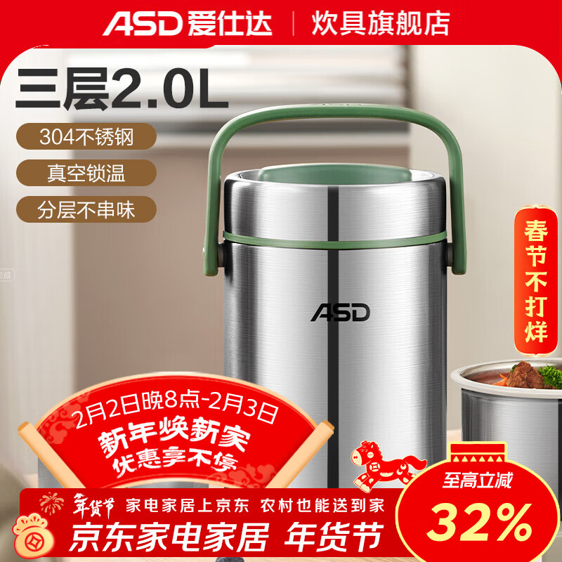 爱仕达 304不锈钢三层保温饭盒2L