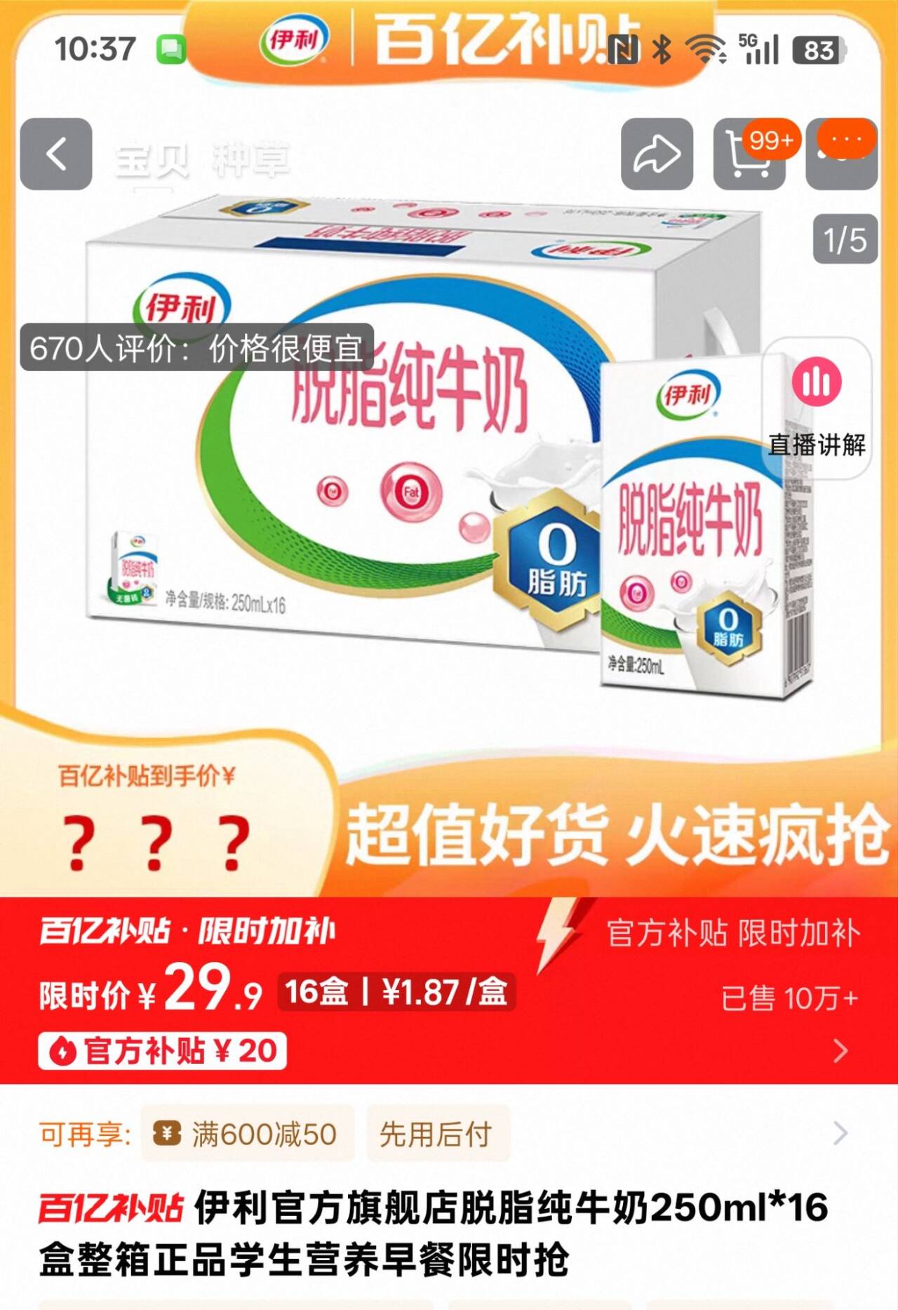 【伊利】脱脂高钙纯牛奶250mL*16盒