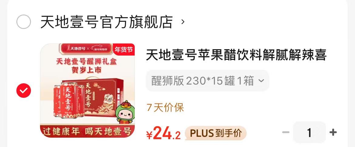 天地壹号 苹果醋饮料 醒狮版230*15罐1箱【24.2】