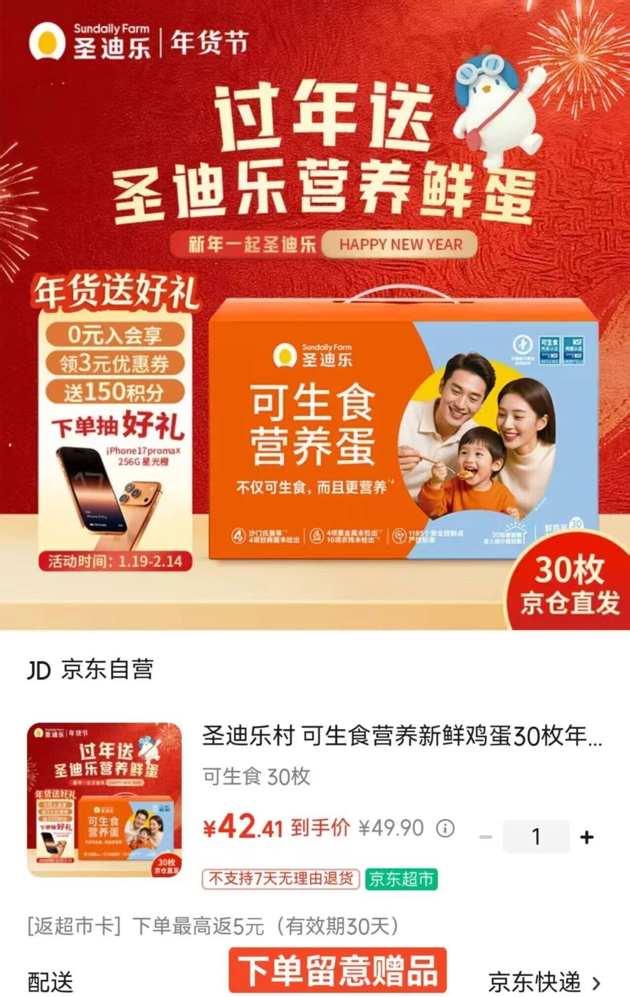 【自营】圣迪乐村 鲜鸡蛋30枚