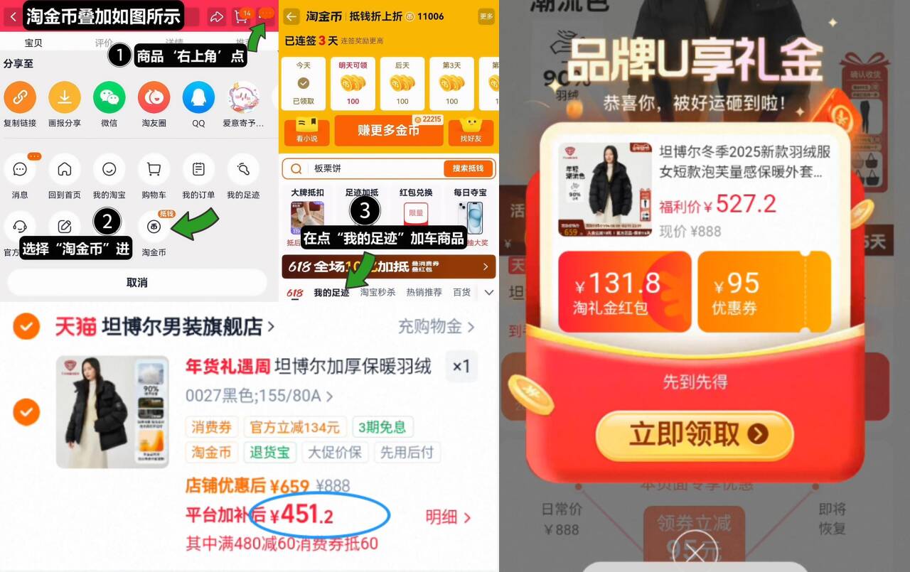 451亓叠礼金 16淘金币 坦博尔 新款女士短款羽绒服 1、需叠88vip480-60消费券好单发报员2026年02月04日 12:510举报 451亓叠礼金 16淘金币【坦博尔】新款女士短款羽绒服1、需叠88vip480-60消费券2、如图点右上角3个点,选淘金币3、选我的足迹-找到商品拍下https://m.tb.cn/h.7GeJew1复制文案