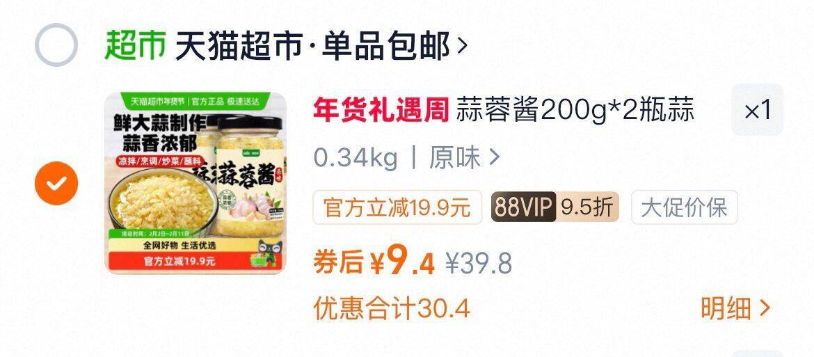 9.4亓,折4.7亓/瓶 觅趣熊 蒜蓉酱200g*2瓶好单发报员2026年02月04日 16:390举报 9.4亓,折4.7亓/瓶觅趣熊 蒜蓉酱200g*2瓶https://m.tb.cn/h.7t77zEv复制文案