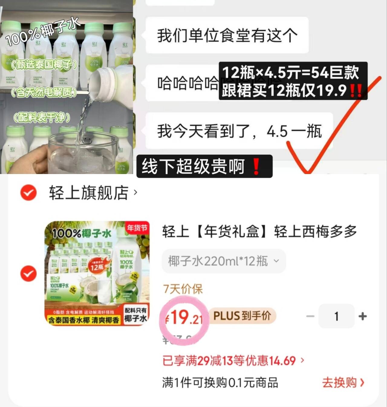 1.6元/瓶轻上100%椰子水