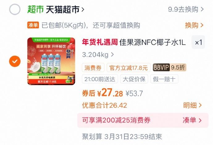 合理凑单后,拍1件vip【27.28】