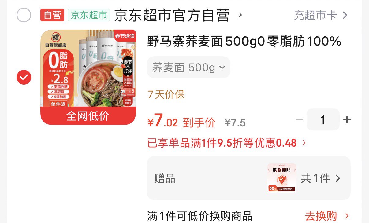 2亓 500g荞麦面条 付7,贈5元津贴
