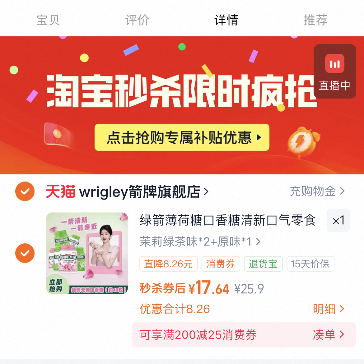 下拉详情拍,17.6亓,折5.8亓/瓶 绿箭无糖口香糖约40粒*3瓶好单发报员2026年02月24日 18:580举报 下拉详情拍,17.6亓,折5.8亓/瓶 绿箭无糖口香糖约40粒*3瓶https://m.tb.cn/h.iaxA65i复制文案