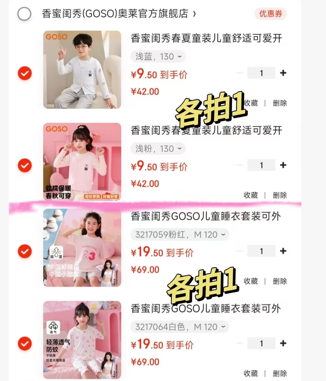 香蜜闺秀GOSO 儿童睡衣套装家居服,任选2件【39】