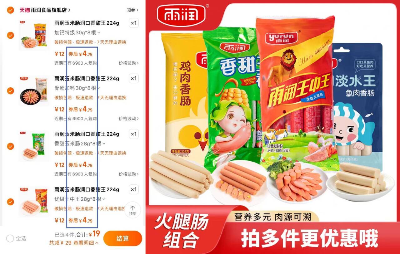 【雨润旗舰店】火腿肠组合4包共32根