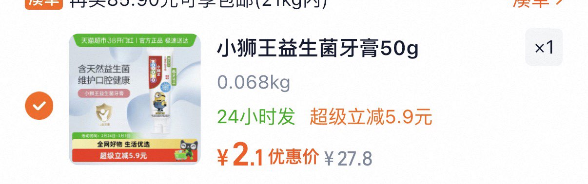 部分地区有补贴4.4 小狮王母如益生菌6-12岁儿童牙膏草莓含氟含钙50g 淘金币页面搜索商品标题加购包郵