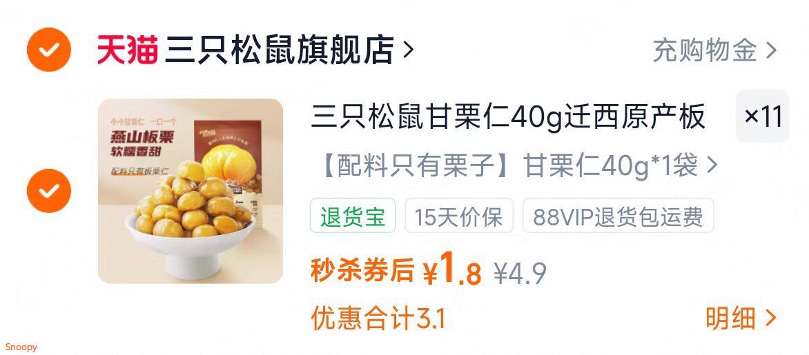 三只松鼠板栗仁40g*11元19 拍11件才成立,折1.8/袋好单发报员2026年02月28日 00:360举报 三只松鼠板栗仁40g*11元19拍11件才成立,折1.8/袋https://m.tb.cn/h.i07Jhq5复制文案