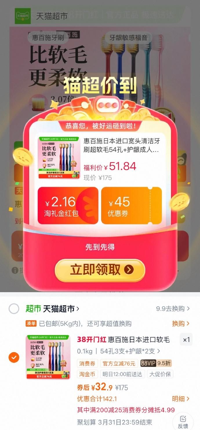 惠百施进口宽头牙刷54孔3支 护龈2支,领礼金