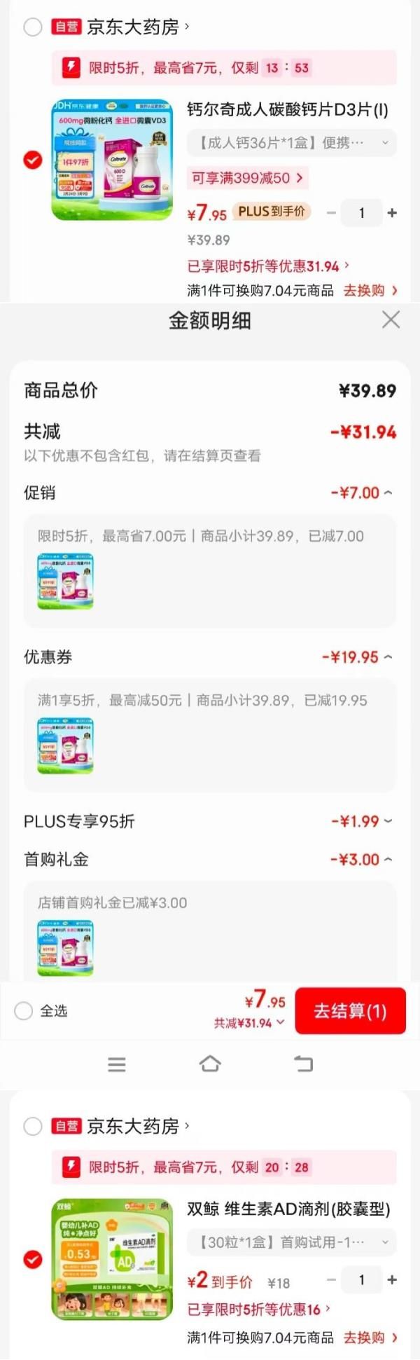 弹5折立减,太多可买了,钙尔奇 成人碳酸钙片D3片I36片,【7.95】