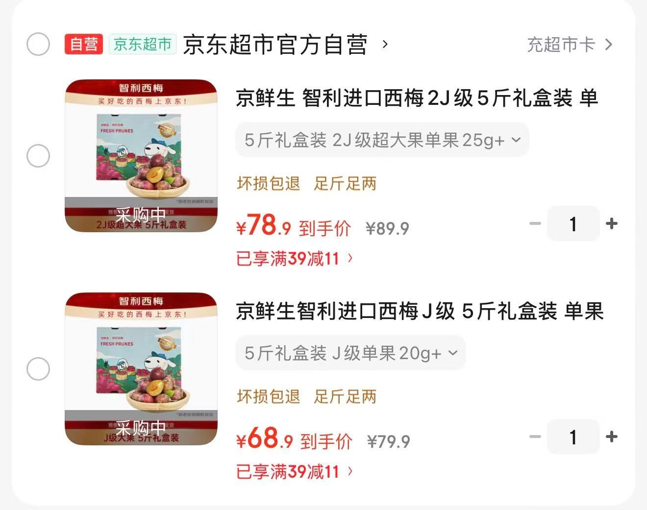 京鲜生 智利进口西梅2J级5斤礼盒装 单果重25g起【78.9】