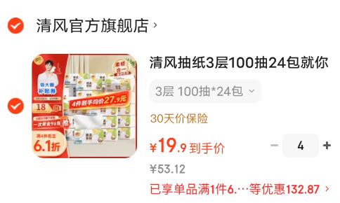 清风 就你抽纸 3层100抽*24包