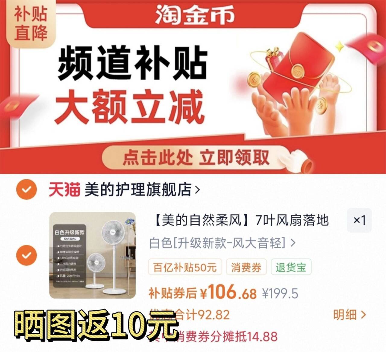 106-晒图返10=96元 1、下拉详情,加1件 美的电风扇静音落地扇好单发报员2026年03月03日 13:240举报 106-晒图返10=96元1、下拉详情,加1件美的电风扇静音落地扇https://m.tb.cn/h.icgsDrQ--2、凑1件,用200-25消费券https://m.tb.cn/h.iYHHA5H复制文案