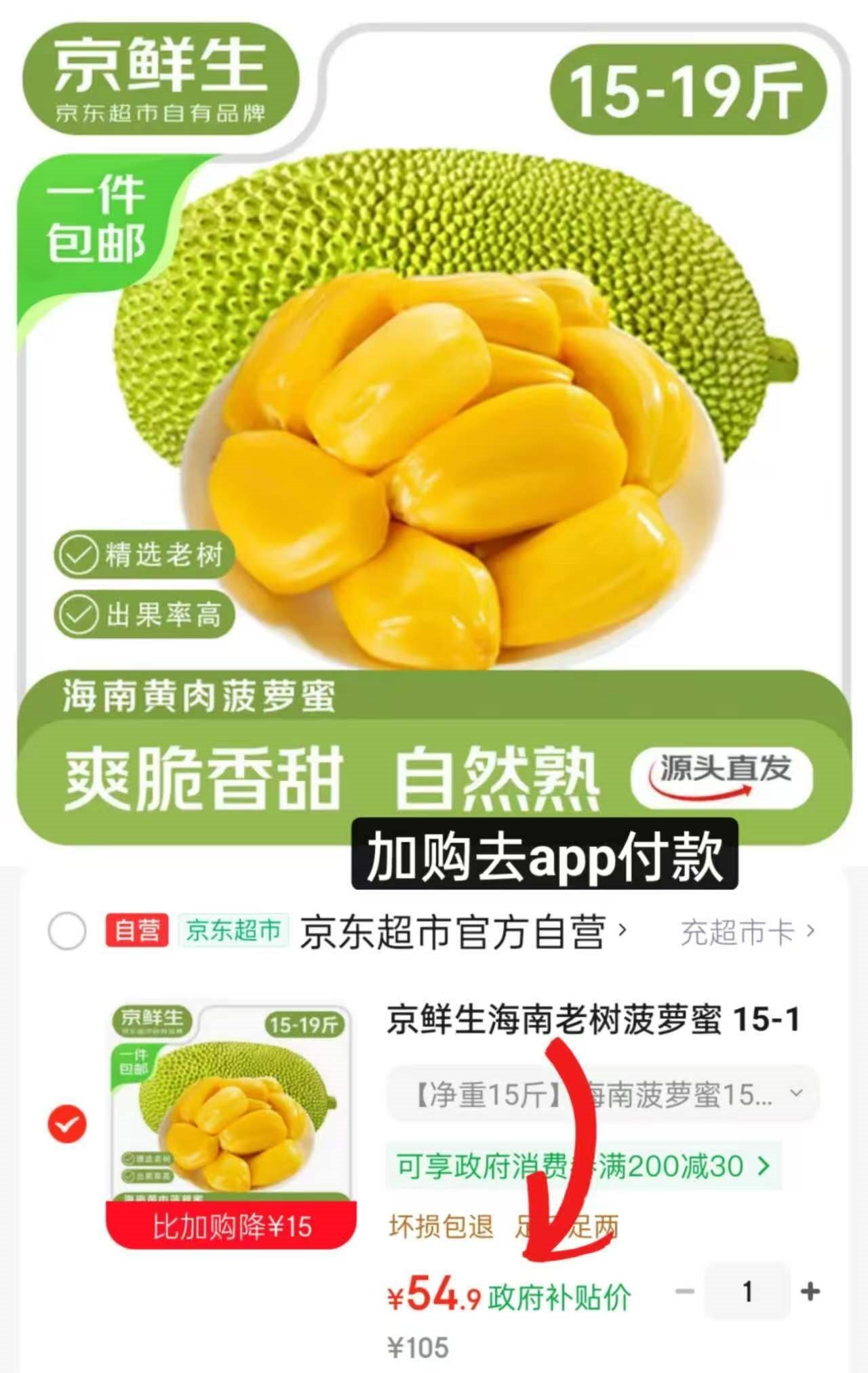 菠萝蜜.限量抄底 跳转APP领100-15券 京鲜生 海南菠萝蜜15-19斤/个