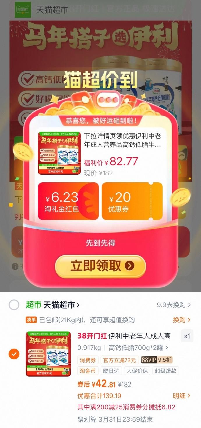 伊利中老年成人高钙低脂牛奶粉700g*2罐,领礼金