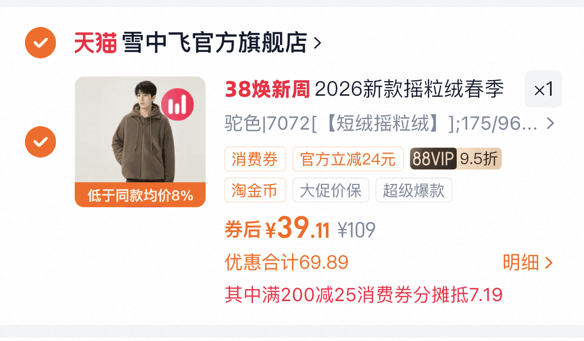 39亓 1、拍1件 雪中飞 运动摇粒绒外套好单发报员2026年03月04日 23:080举报 39亓1、拍1件雪中飞 运动摇粒绒外套https://m.tb.cn/h.i1iqxgv--2、凑1件,可退了https://m.tb.cn/h.iXPPcFg复制文案