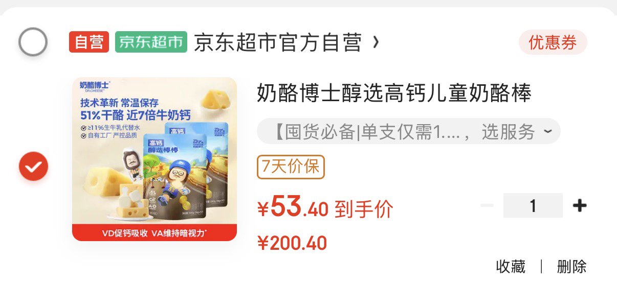 领200-60券 奶酪博士醇选高钙奶酪棒60支 拍下53.4亓 折0.89亓/支 好单发报员 2026年03月05日 10:20 0 举报 领200-60券https://u.jd.com/NGbBwdu奶酪博士醇选高钙奶酪棒60支拍下53.4亓 折0.89亓/支https://u.jd.com/NGbqzL3 复制文案