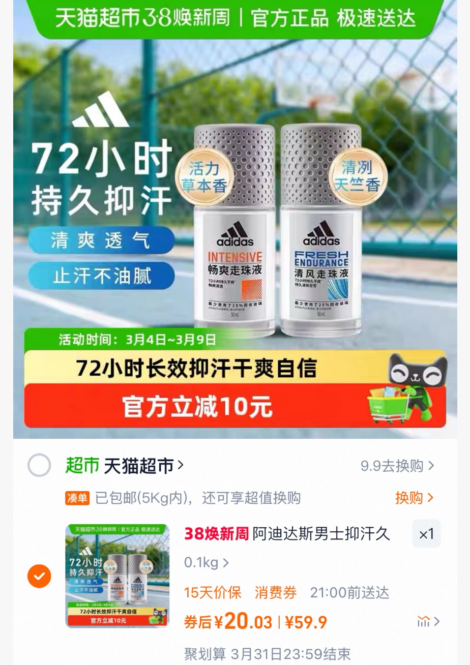 阿迪达斯男士清风止汗滚珠50ml*2,赠100ml沐浴露