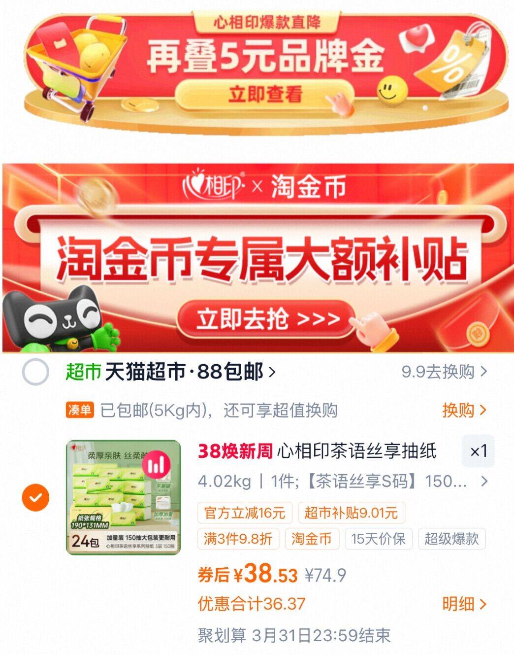 33.5亓折1.3亓/包 心相印 茶语丝享抽纸3层150抽*24包 ①先下拉領5亓品类卡 好单发报员 2026年03月05日 17:14 0 举报 33.5亓折1.3亓/包心相印 茶语丝享抽纸3层150抽*24包①先下拉領5亓品类卡②再下拉进淘淦币提交变价https://m.tb.cn/h.icZly67 复制文案