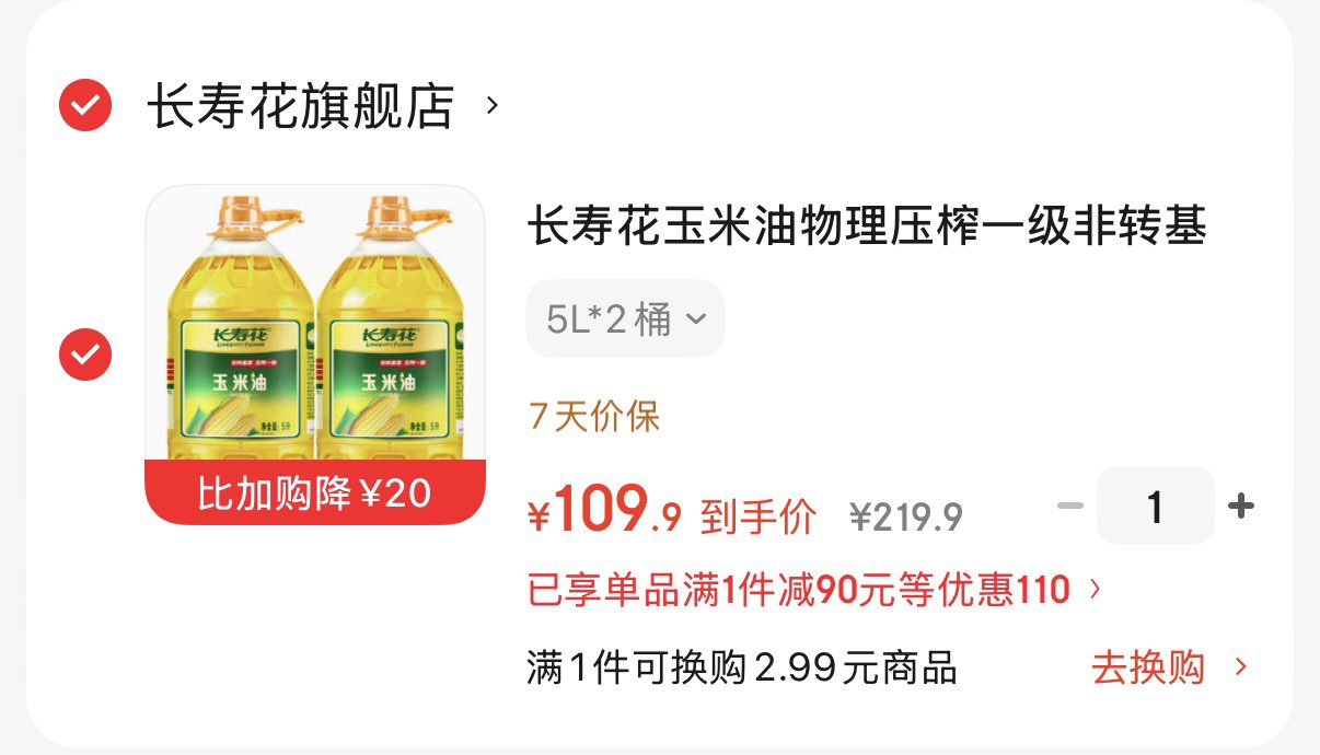 长寿花压榨一级玉米油5L*2桶