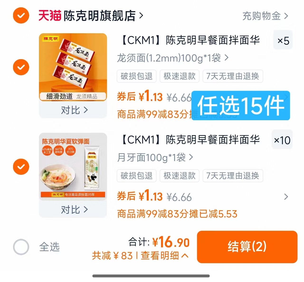 1.1亓/件15件到手16.9亓 陈克明早餐面拌面面条15件 麦香超浓郁 不添加增筋剂!好单发报员2026年03月06日 08:190举报 1.1亓/件15件到手16.9亓陈克明早餐面拌面面条15件https://m.tb.cn/h.iXYZ3Az麦香超浓郁 不添加增筋剂!复制文案
