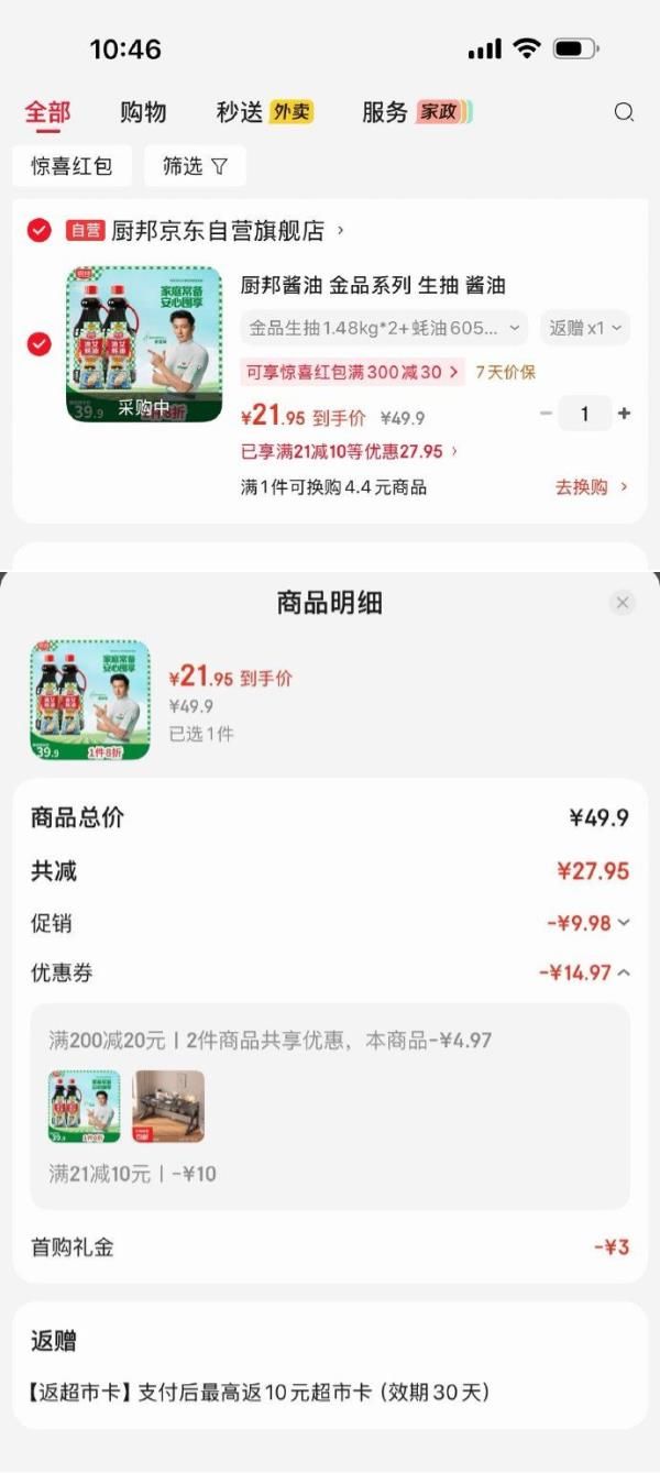 3首单,凑后【21.95】返10卡