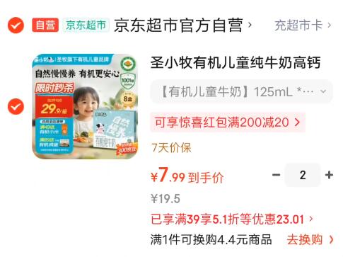 圣小牧 有机儿童纯牛奶125ml*8盒